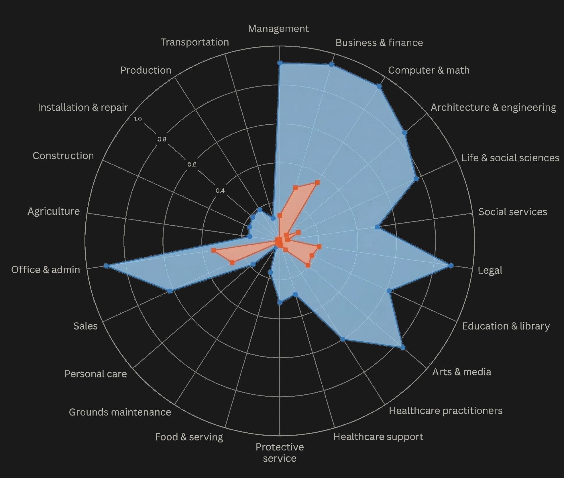 The iGaming sector a unique pillar of the economy employing 10,000+ people across software development, customer support, compliance, and marketing — sits squarely in the crosshairs. Computer programmers (74.5% observed exposure), customer service reps (70.1%), and financial analysts (65%) are the top-exposed occupations nationally.